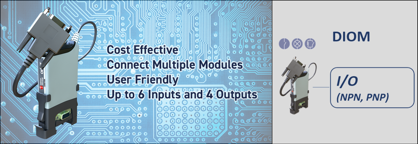 El módulo de entrada/salida digital (DIOM) permite que la red de Orbit® interactúe con entradas discretas, como microinterruptores o sensores de proximidad que se pueden usar para activar un conjunto de mediciones. Las señales de salida desde el DIOM se pueden usar para interactuar con componentes externos como relés o indicadores para controlar un proceso o indicar que una pieza medida se encuentra dentro o fuera de la tolerancia.
